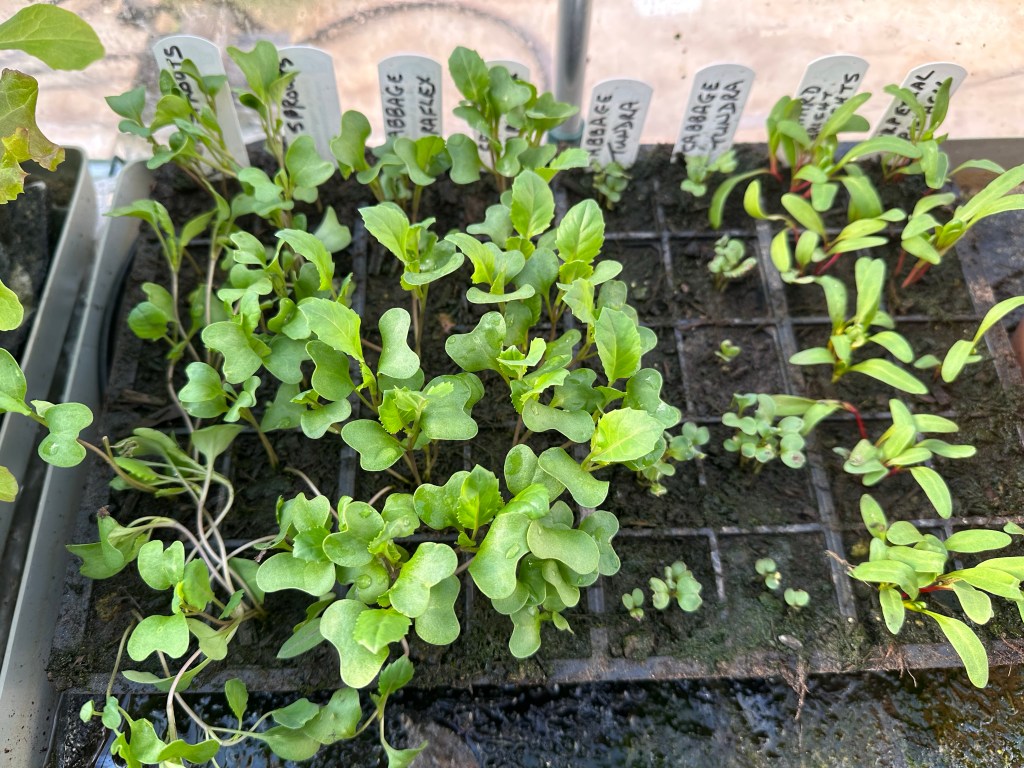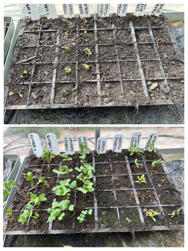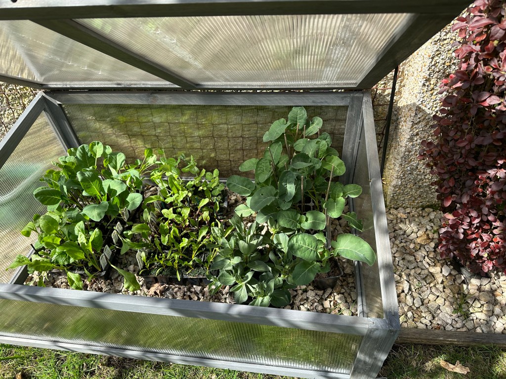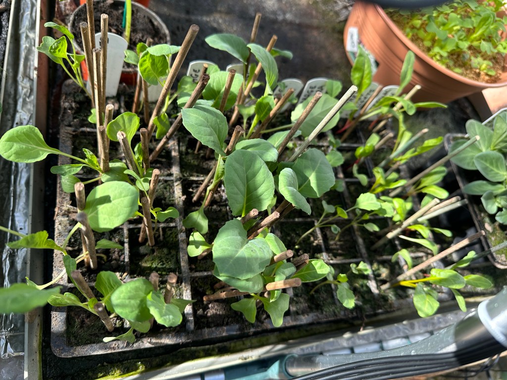 I have moved most of my brassicas (cabbages, Brussels sprouts, etc) into the cold frame to harden off. This is basically a process of allowing the plant to acclimatise to the colder weather outside, so that when they are planted out into the allotment they continue growing away strongly. I have never done this before. I have always just planted them directly out from the greenhouse into the veggie garden / allotment. I must admit that the plants always do seem to get a bit of a shock and take a few weeks before moving on again. It will be interesting to see if this cold frame malarkey makes any difference!