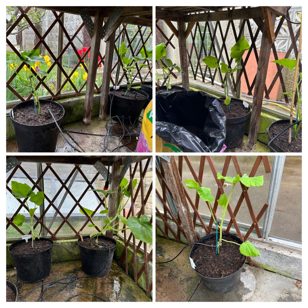 The Squashes which are staying in the greenhouse to grow are potted up and placed into their final positions within the greenhouse. Trellis is erected for them to grow up and irrigation system is installed, but not yet connected.