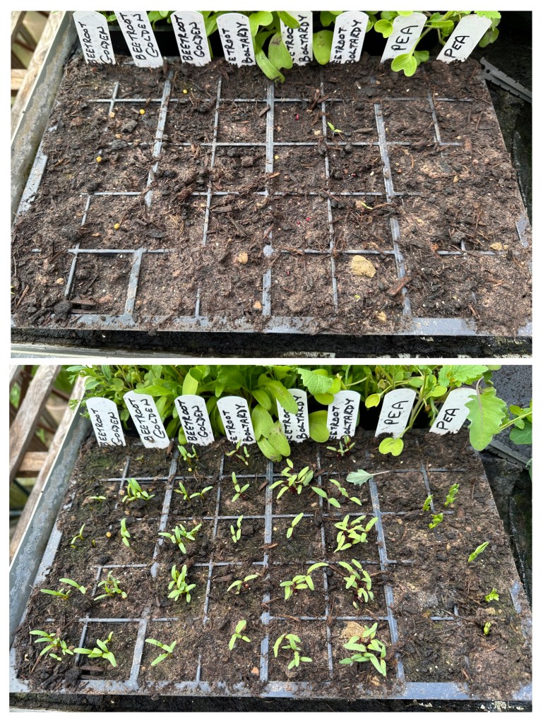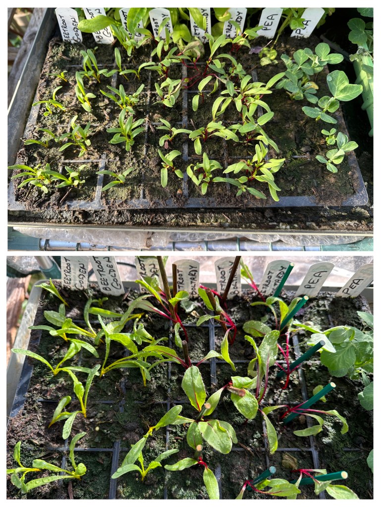 With a similar theory in mind, I have sown the second planting of broad beans directly into the allotment bed (picture on the right). I am so confident in these germinating that I have even erected the support canes for them 🫣