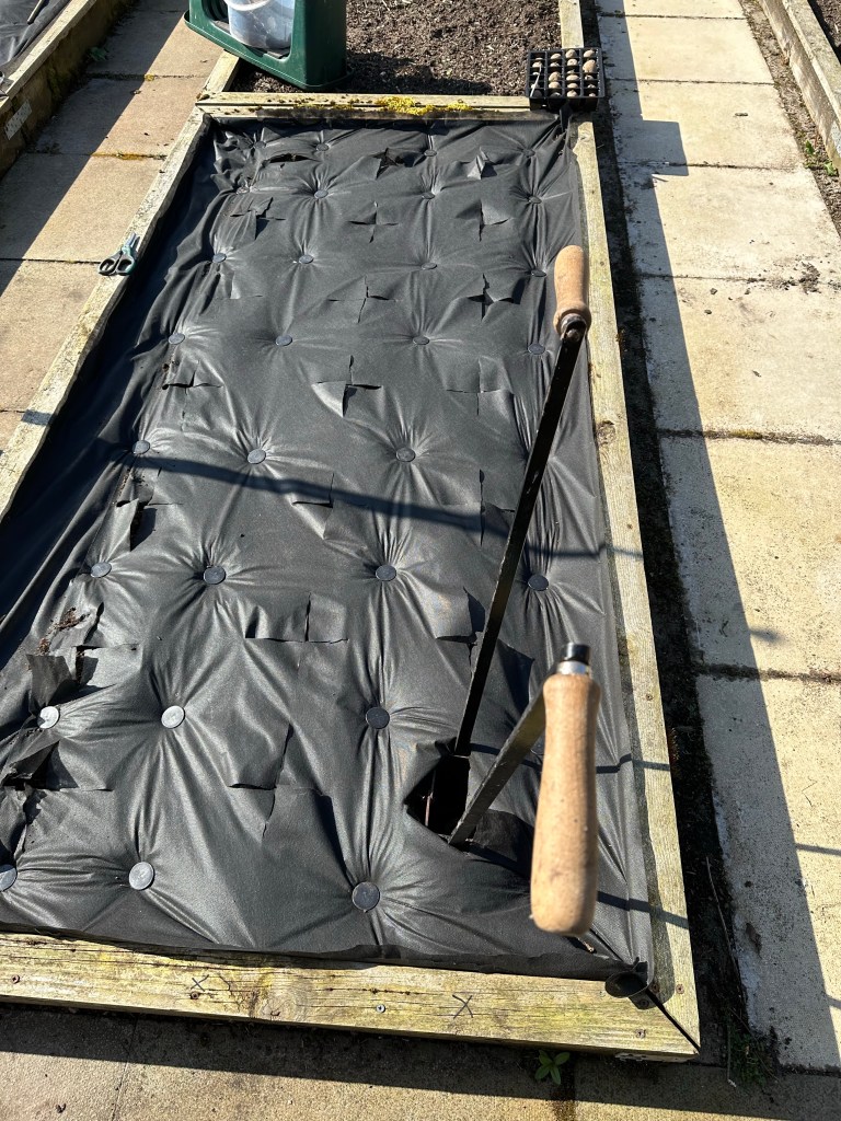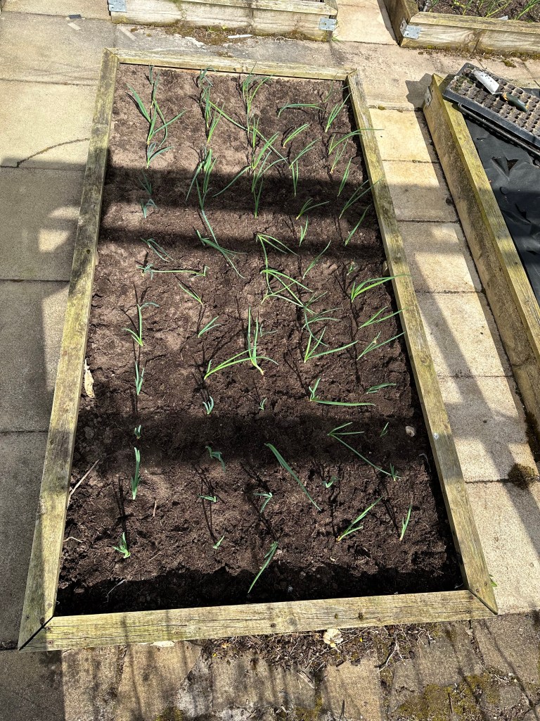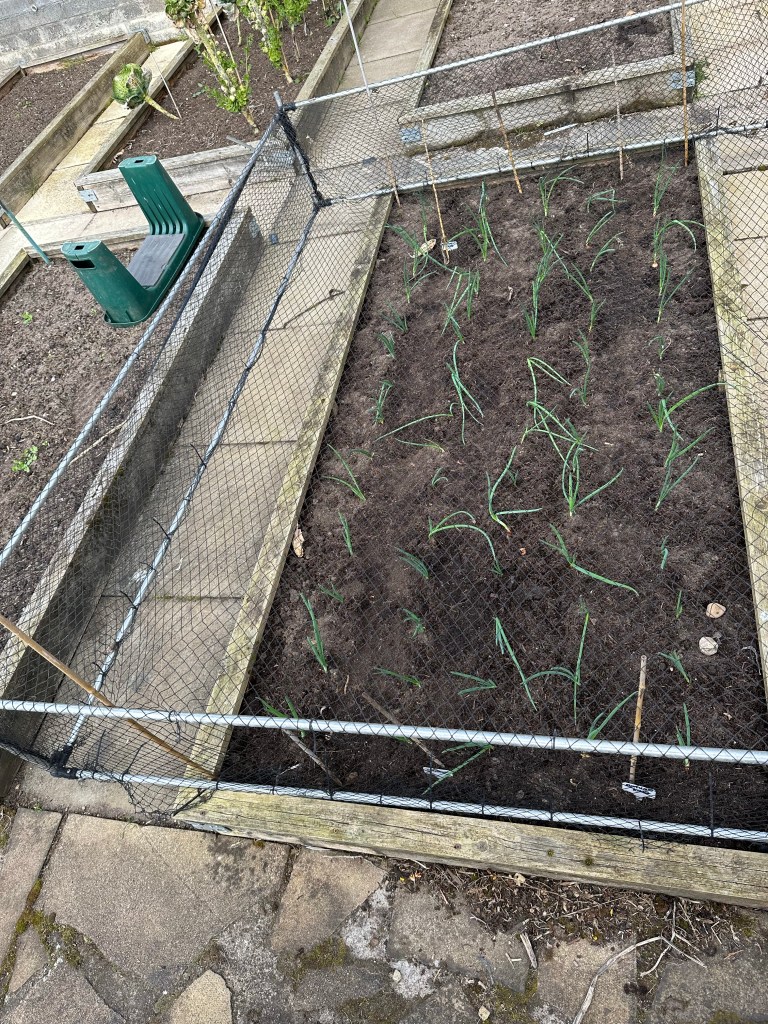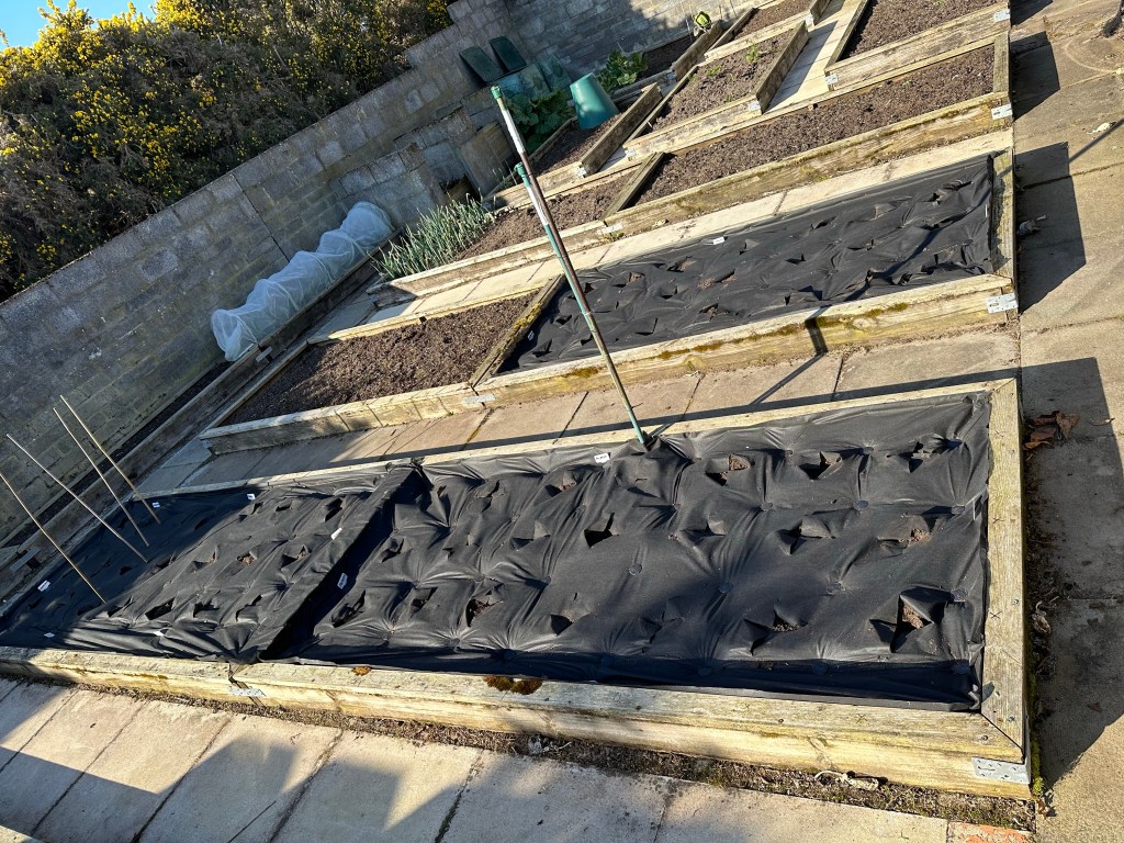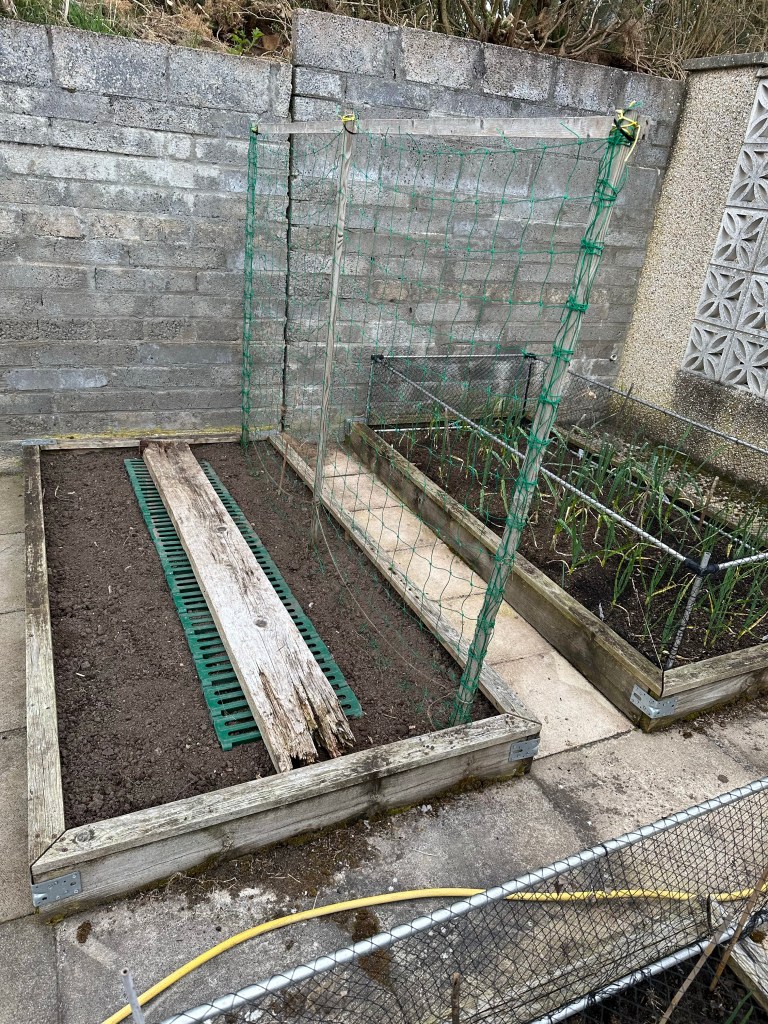 I erected a couple of ‘wigwam’ support structures for my runner beans (in the left picture). I have sown the seeds as well, in the hope that the ground was warm and that they will germinate. Hmm 🤨.. We’ll see!