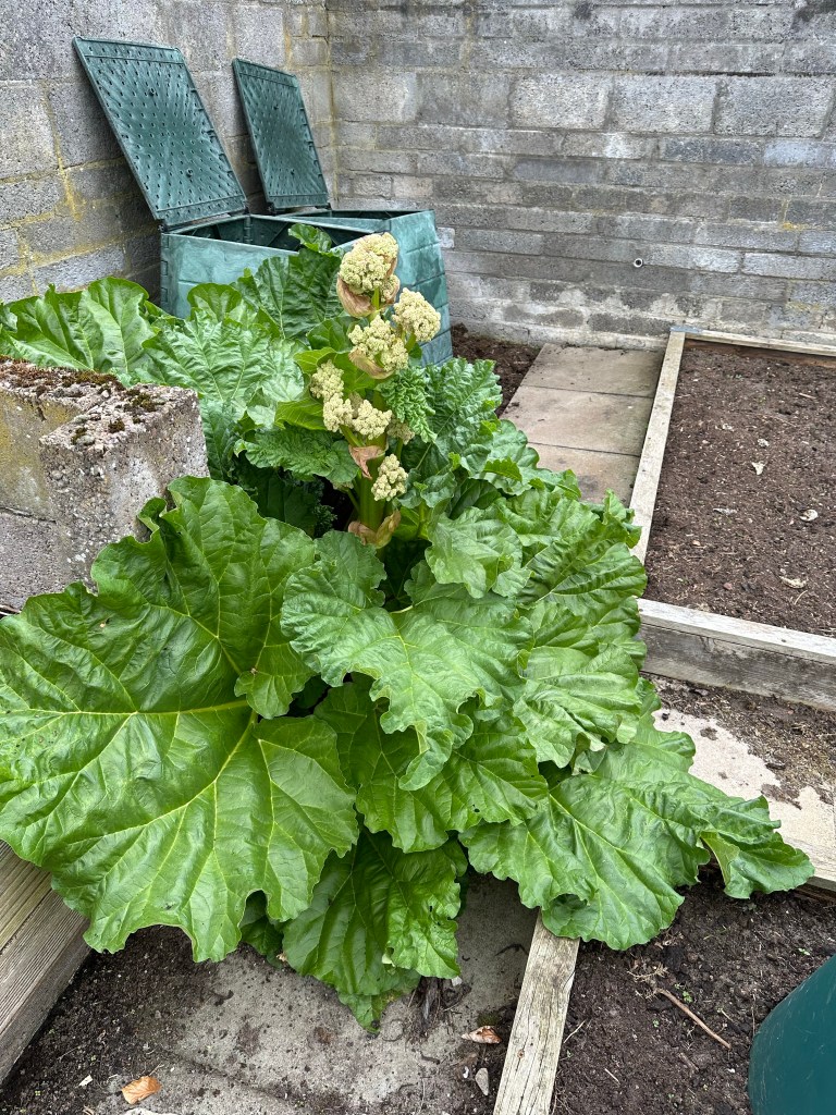 But look at the triphid growing up out of the middle of it. This is a rhubarb flower. As with most vegetables, if a plant is allowed to flower, if feels that it has done it’s duty in life (reproduced) and dies. The secret is to not let the plant flower and it will keep beavering away as before. So this flower spike must be cut out ASAP to keep the plant producing well. Done ✅