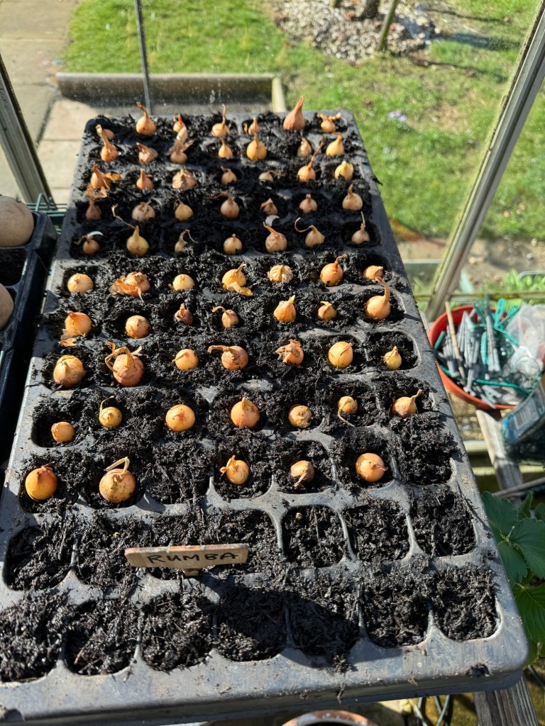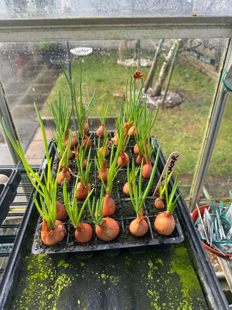 The Onion sets (Rhumba) have arrived and have been planted in a tray in the greenhouse to get them growing before planting them outside into their final position.