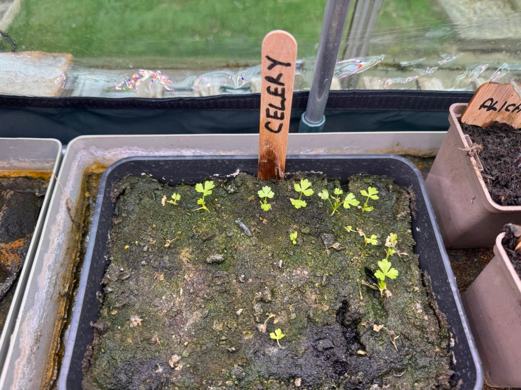The poor celery seeds were one of the biggest casualties of the warm period we had just before I got back from holiday – they were the smallest and most vulnerable plants after all! I thought they were dead, but after watering them with a gentle spray, they have resurrected. Not many, I grant you, but enough for us to hopefully get some plants to maturity!