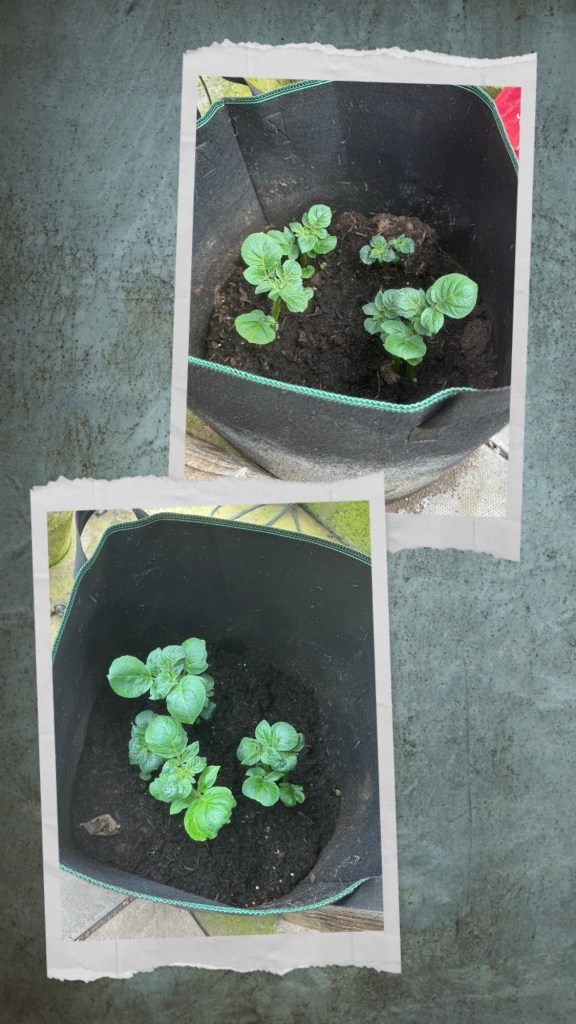I had planted some of these seed potatoes into grow bags in the greenhouse to give us an early potato crop. They have grown well, been topped-up with compost, and continue to look great. (Right)