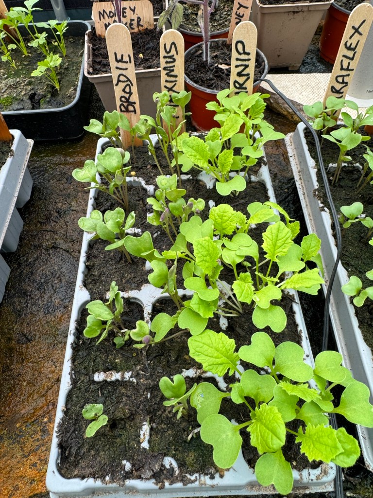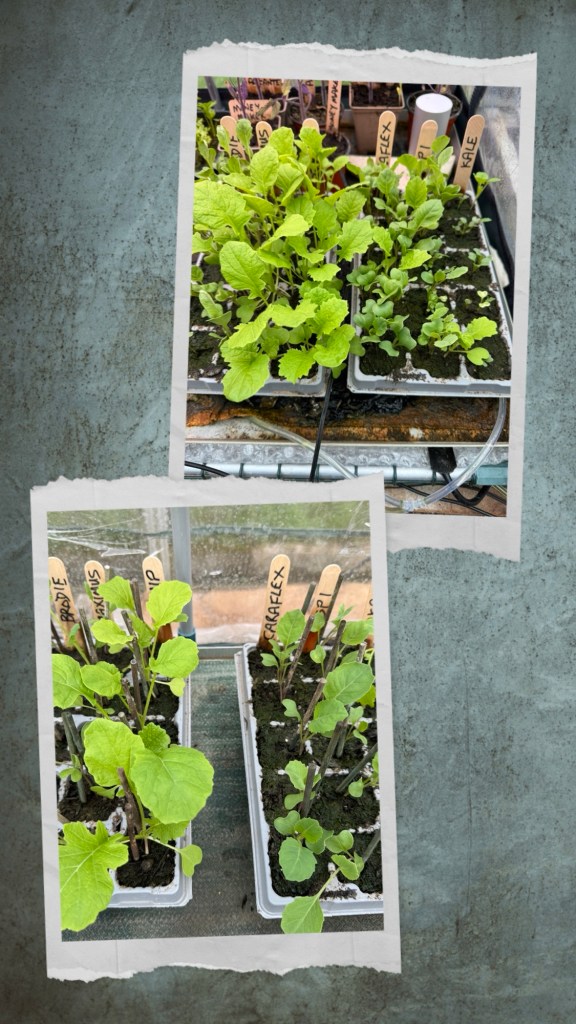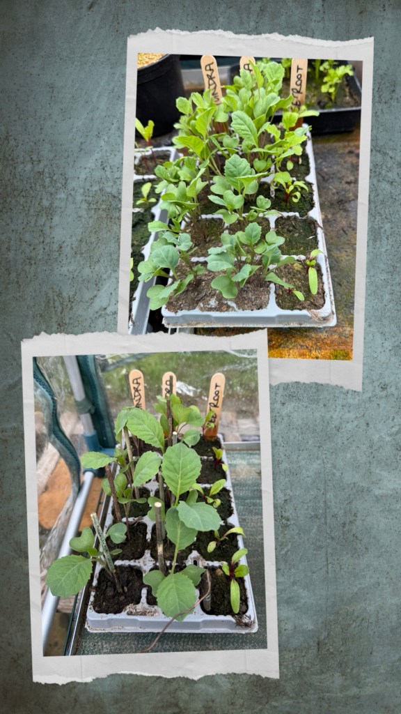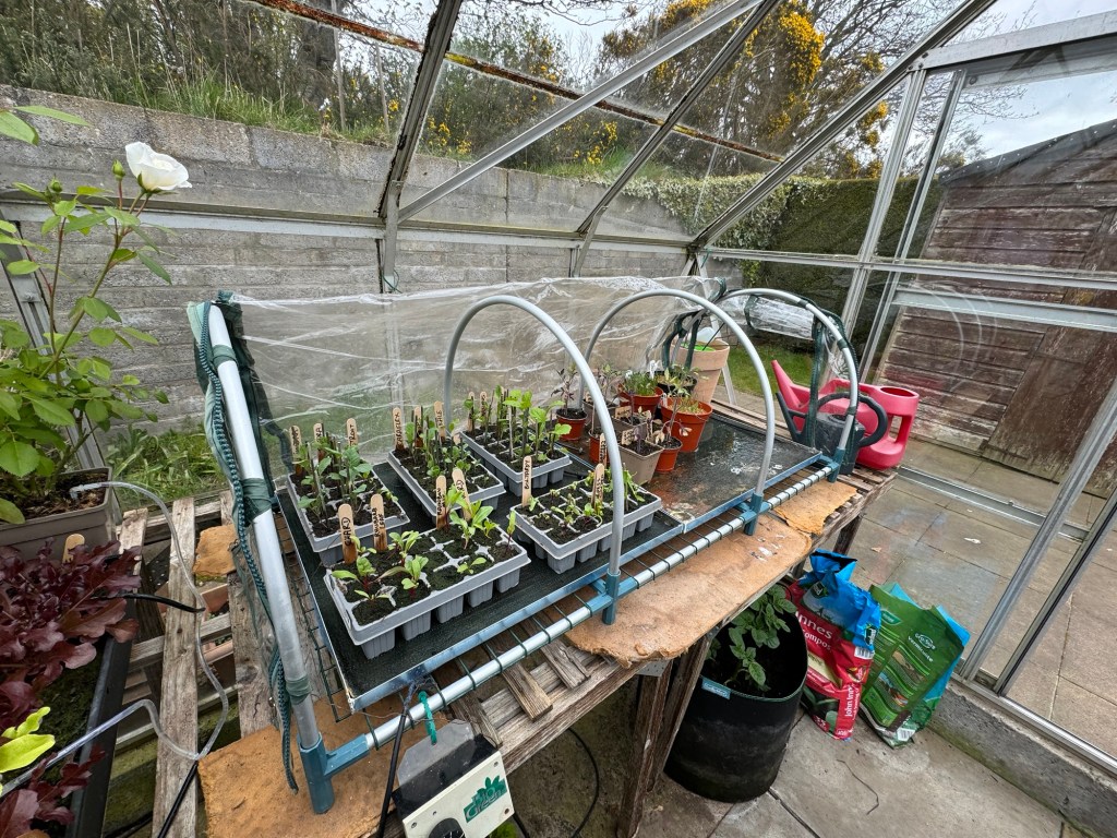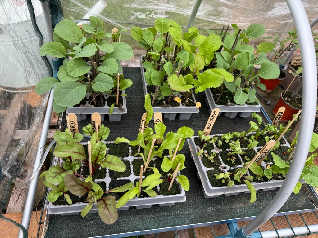This contains Summer Cabbage (Hispi and Caraflex); Kale (Nero di Toscana); Winter Cabbage (Tundra); Beetroot (Detroit Globe); Brussels Sprout (Maximus and Brodie); Turnip (Golden Ball); Chard (Rhubarb Leaf and Rainbow Mix); Beetroot (Burpee’s Golden and Boltardy). It has been unheated and is allowing these plants to gradually acclimatise to our temperatures. They will be moved into the cold frame soon (see below).