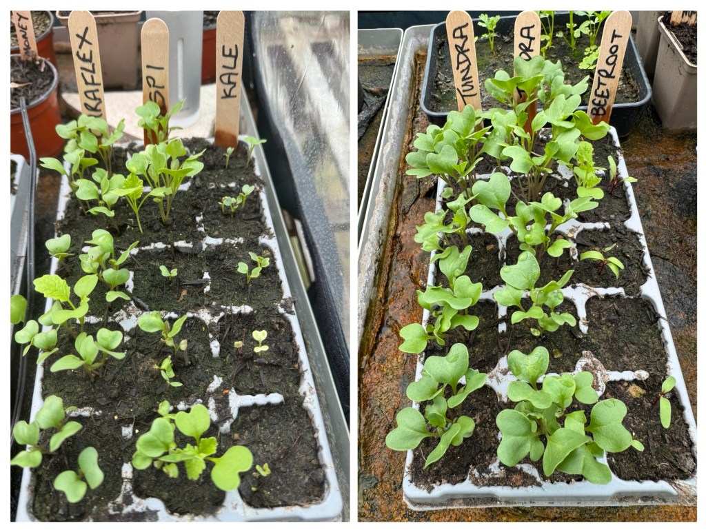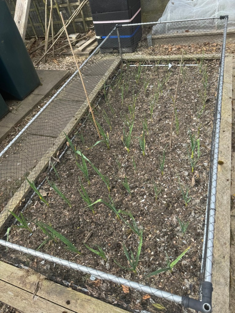 Left: Garlic (Solent Wight & “Granny’s”) are both looking good after sprouting during the depths of winter