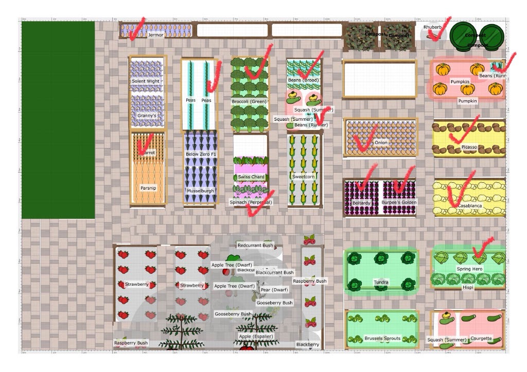 I have ticked off the crops which have already been planted / sown in the Veggie Garden / Allotment. As you can see, the vast majority of the crops are now in. Those which are not ticked are in the greenhouse and will be planted out after the risk of frost is over.