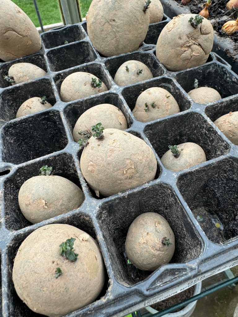 Today is supposed to be the start of some warmer weather, so that’s the potato’s outside the greenhouse now!(left). I hope the weather-man is correct!