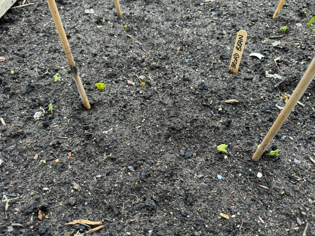 Runner beans (St George) have been sown next to their support stakes which have been tied together in a “wigwam” for strength.