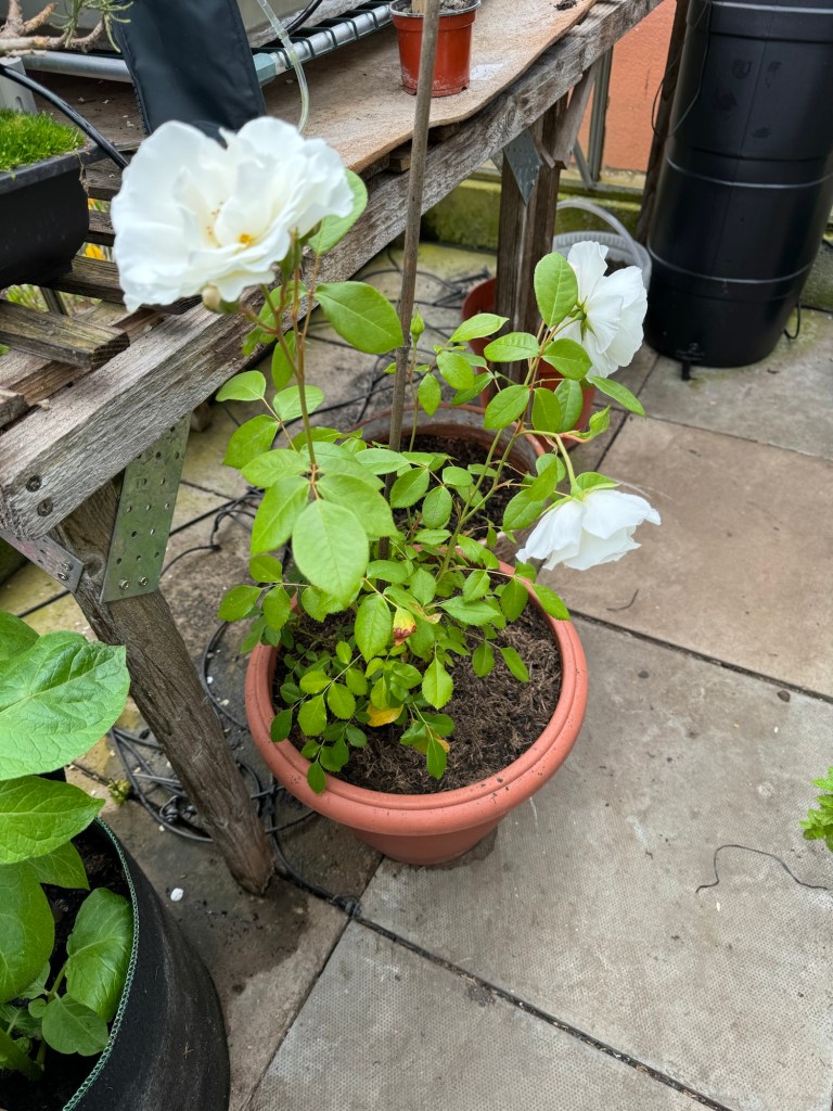 This rose has now been potted up into a larger pot ready to move outside soon.