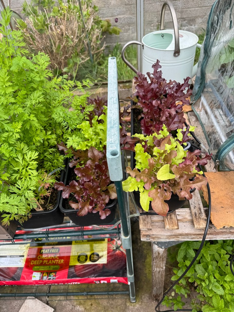 The seed trays (left) planted in February are looking amazing now. The lettuce is ready for munching and the carrots will not be too much longer.