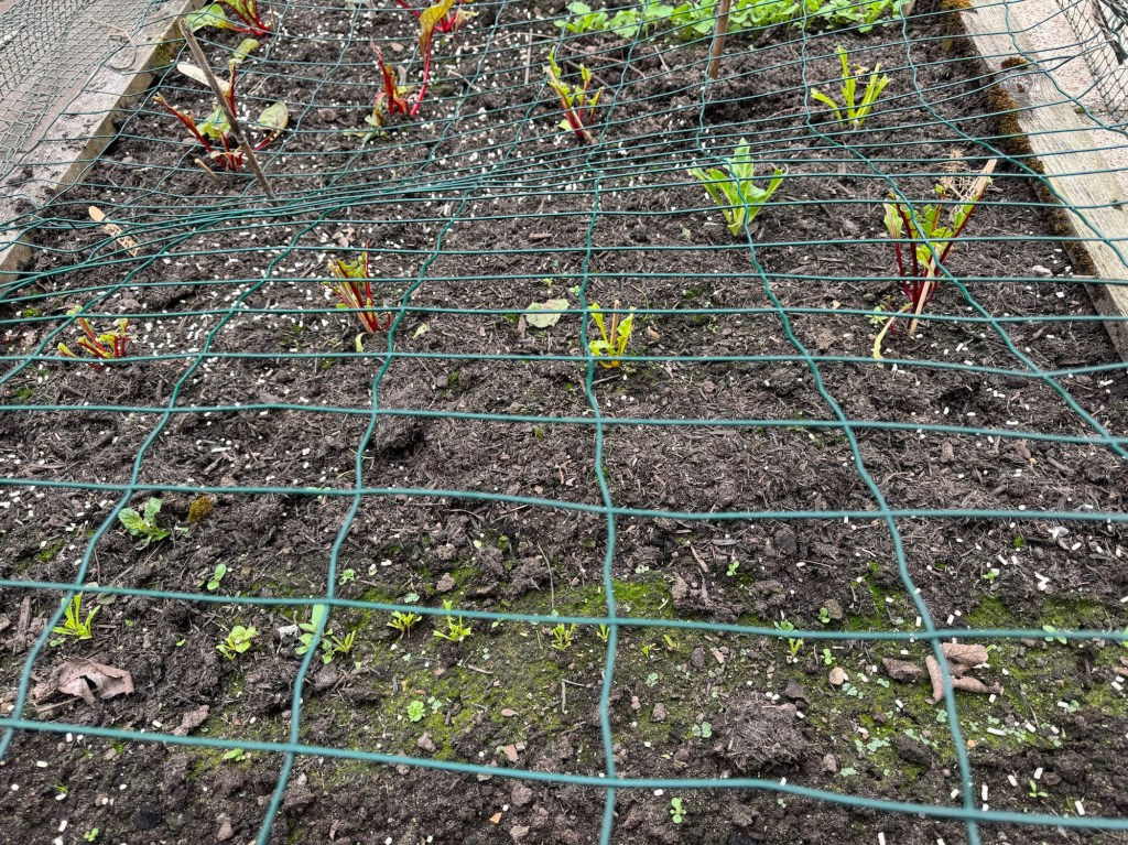 The Chard plants have been out in the veggie garden / allotment for over a week now. Within a day of planting them out, the tender little leaves had been munched, big time! I suspected the blackbirds, pigeons or pheasant. I hastily erected a cage over them to try to keep the scoundrels at bay.