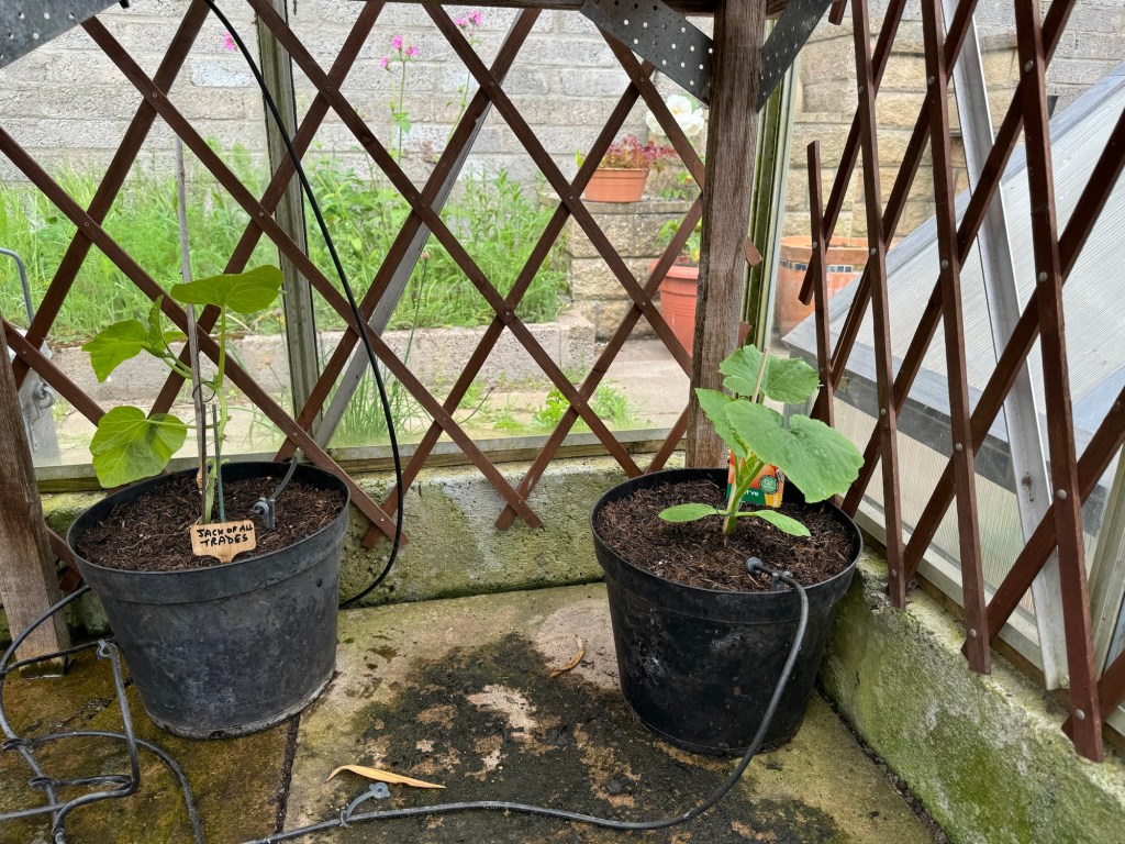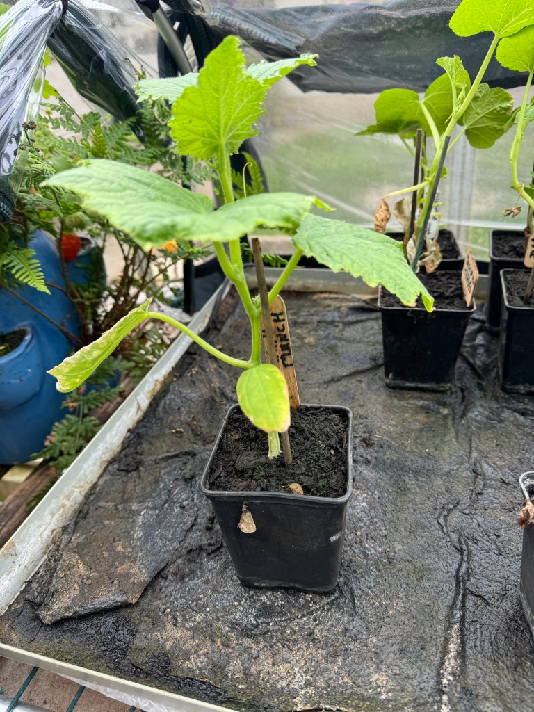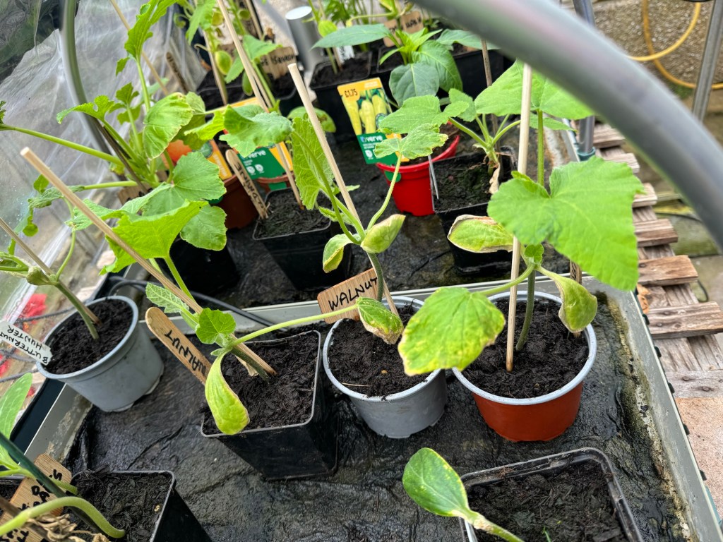 The Gemsquash, Butternut and Pumpkin plants, which were potted up and placed in their final places in the greenhouse last week, have started to shoot up. They are obviously loving their nice big pots full of amazing compost.