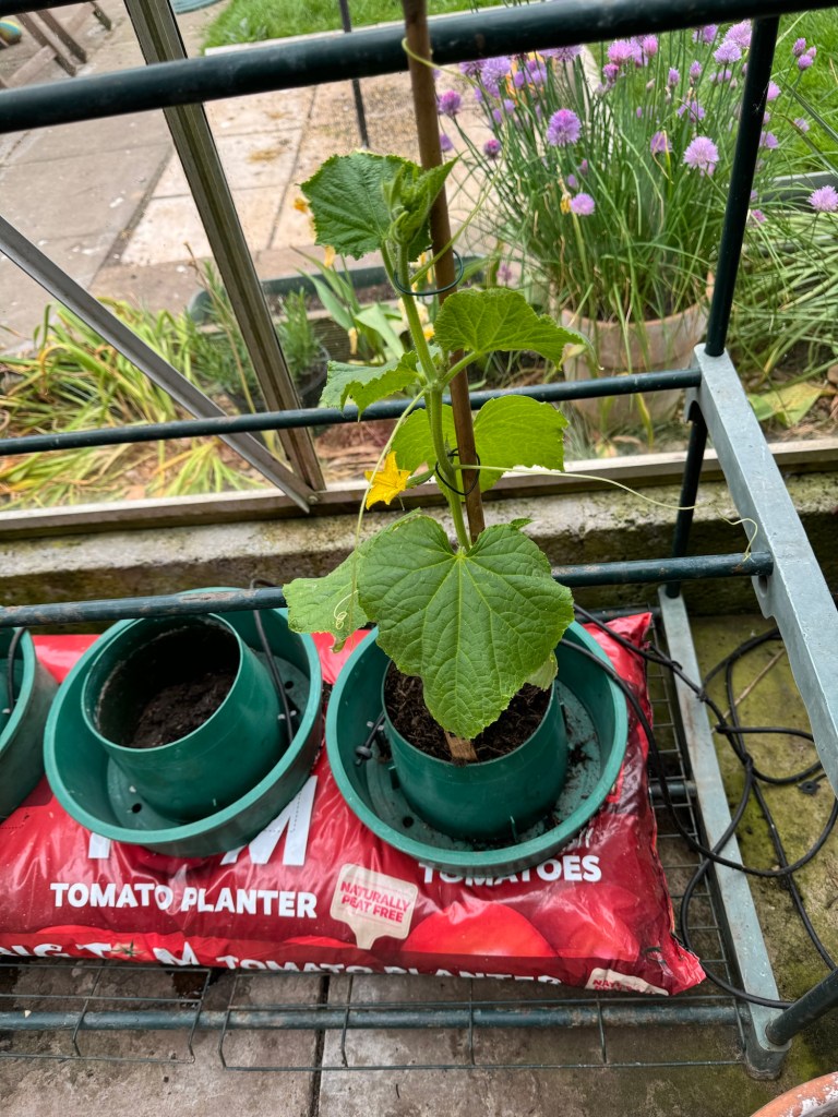 Only one Cucumber (Mini Munch) survived. It was potted up into a grow bag last week. It does look a bit lonely in its grow-bag, but seems to be enjoying it as it has put on at least 6 inches of growth in the last week.