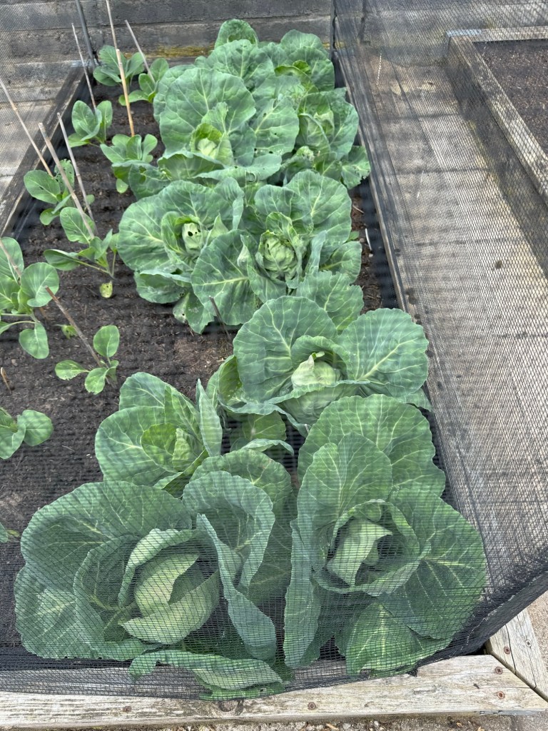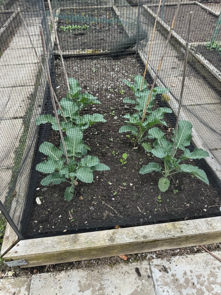 The Spring Cabbages (Spring Hero) were sown in autumn last year and have been in the Veggie Garden / Allotment all the way through winter. They are now growing strongly and are even beginning to form hearts. Wont be long until we are munching on these – next week, I hope.