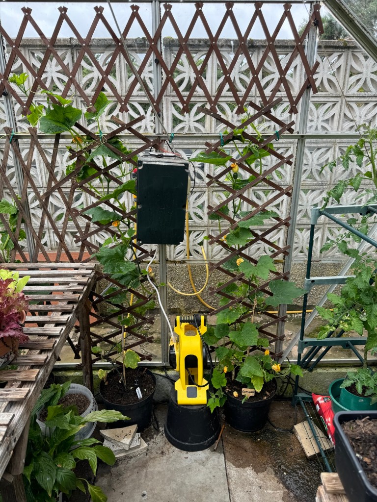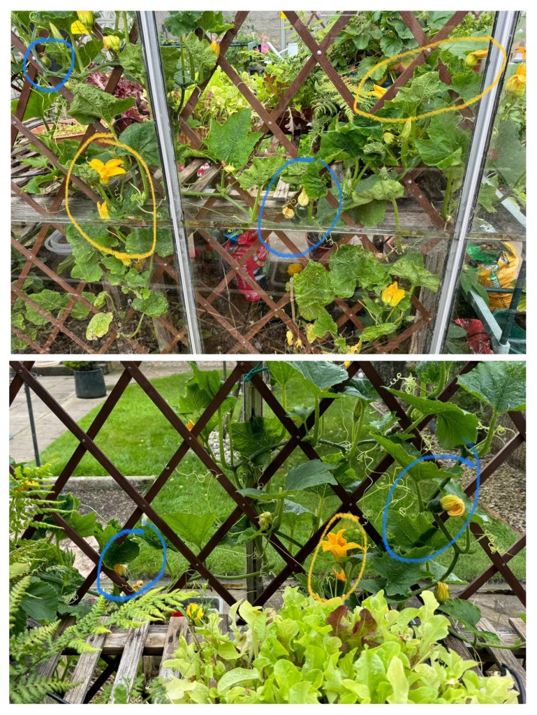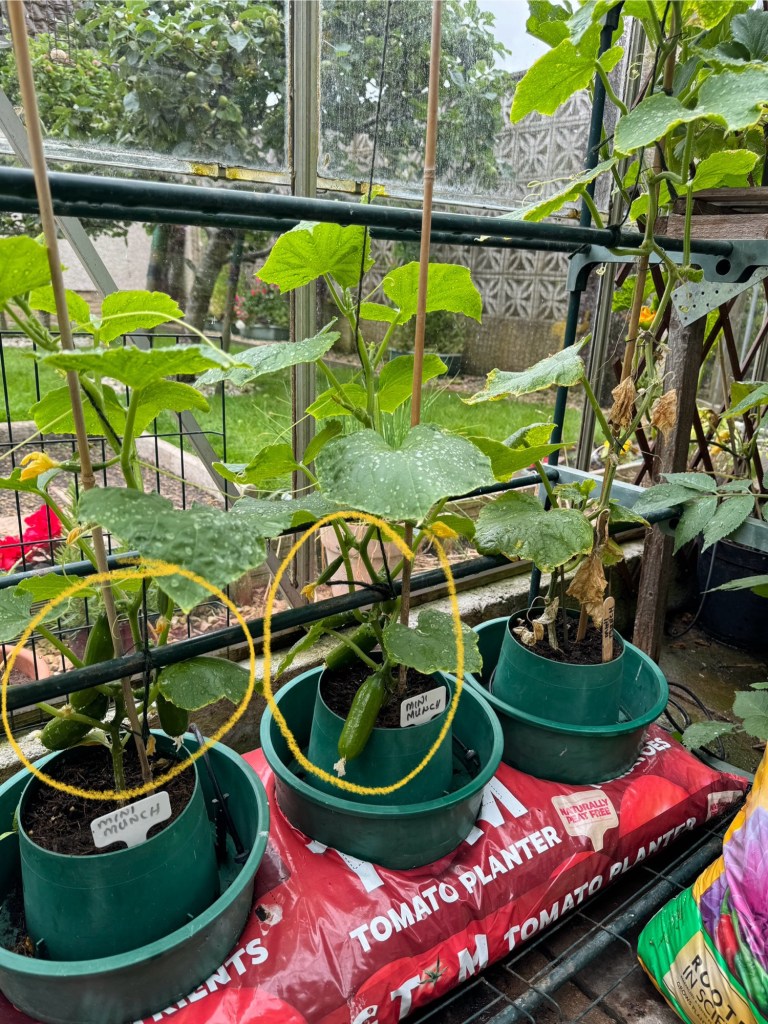 Only one Cucumber (Mini Munch) survived. We have had four or five cucumbers from it so far. The replacement plants, from the second sowing, are now starting to develop cucumbers themselves (yellow circles) and we will be into those in a day or so.