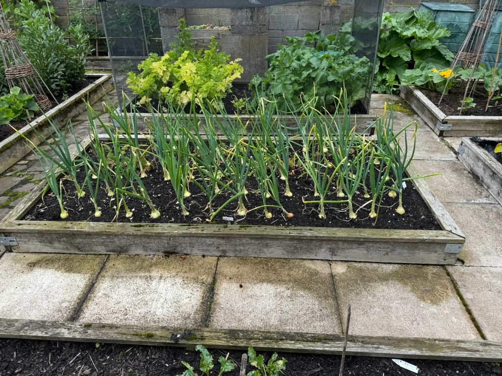 The Garlic (Solent White & Granny’s) have been in the ground since autumn last year. Their leaves are now starting to turn brown. It wont be long until they get lifted out of the soil to dry out.