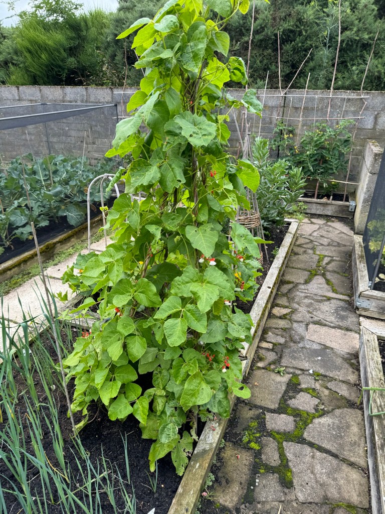 The Runner Beans – St George have reached the tops of their cane supports. They are now flowering away like mad. Delicious Runner Beans to follow 🤞