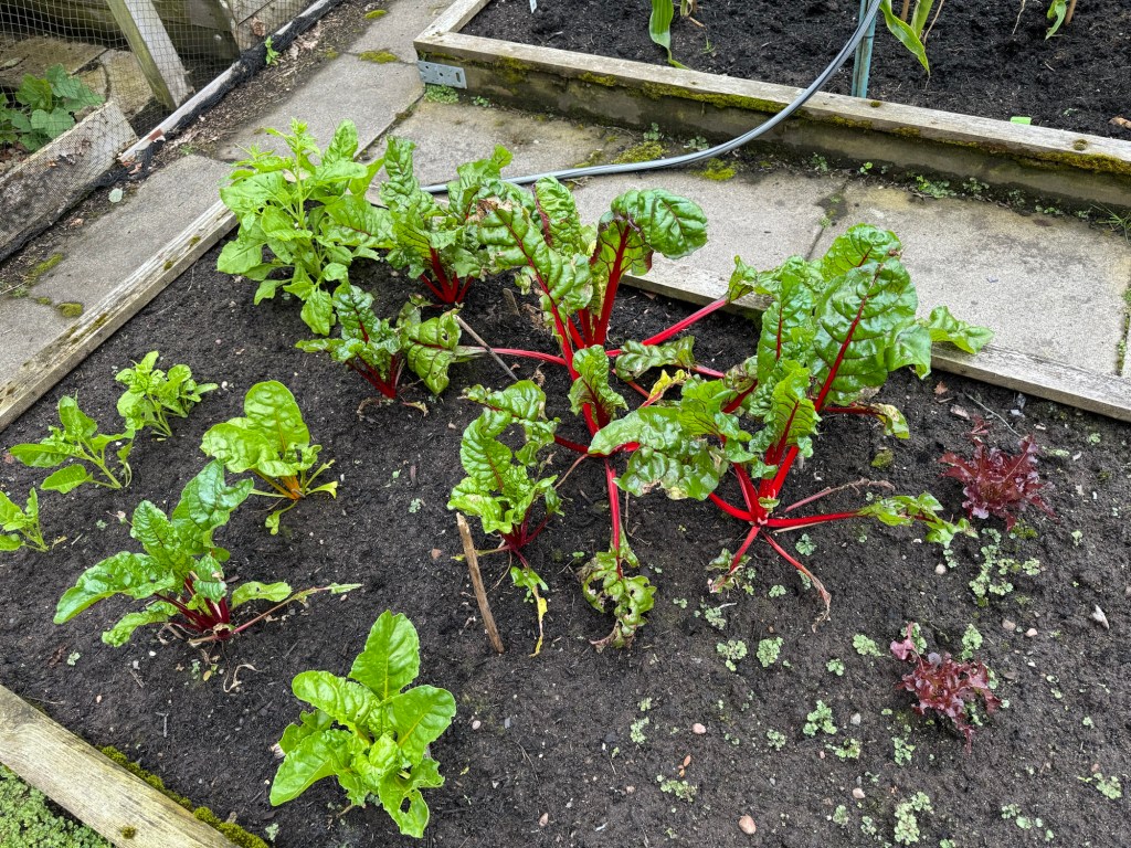 The Chard (right) plants really got hammered this year by either birds or slugs. I have still to determine who the culprit was. Some of the plants have now recovered somewhat. Again, they look a bit bedraggled because we harvested quite a number of the leaves for supper last night.