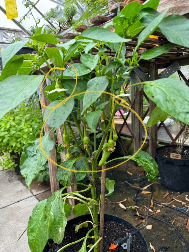 The chilli plant I bought at our local B&Q has also grown up quite nicely. It is now producing several chilli’s with several flowers indicating more to come (yellow circles).