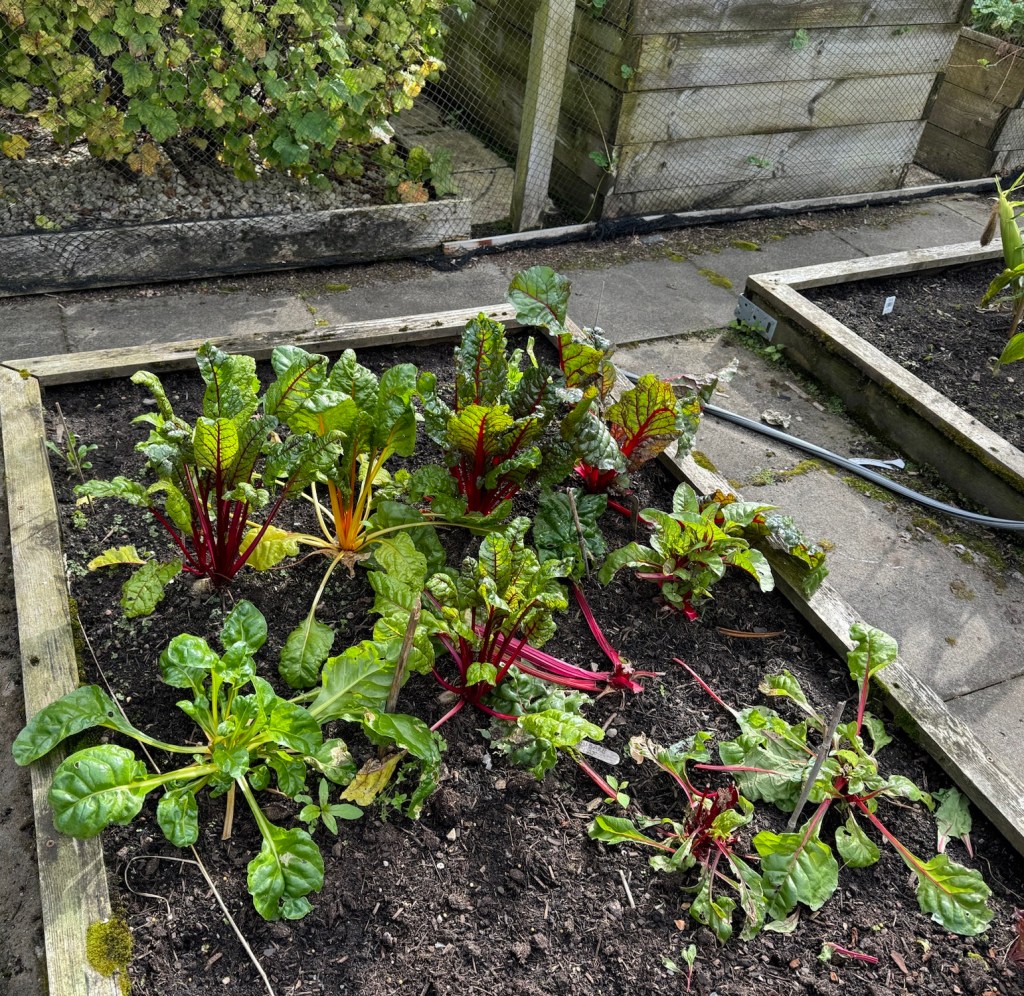 The Chard (right) plants have come on fine after their early decimation by an unknown predator. We have had a few harvests of delicious spinach from them.