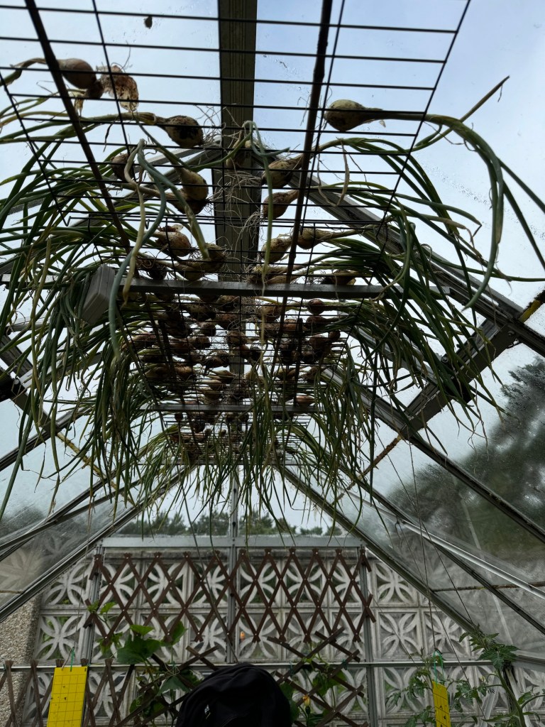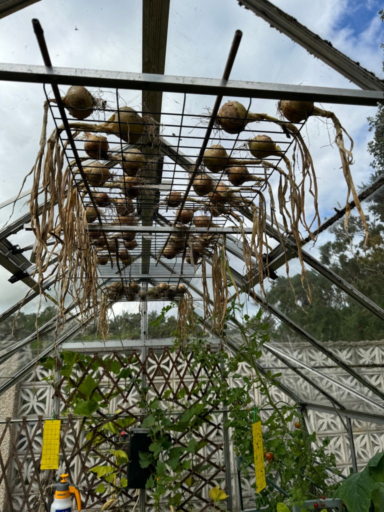 The Shallots have been harvested and are drying on racks in the greenhouse roof.