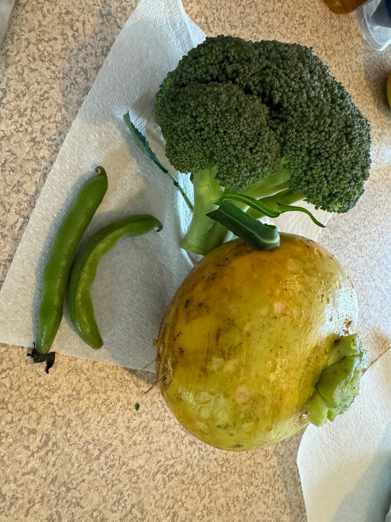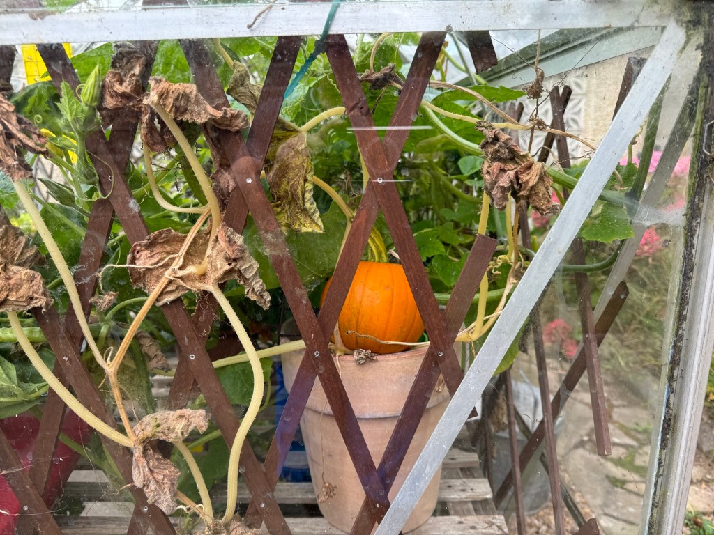 Our only pumpkin in the greenhouse this year. We normally get two or three. It’s small, but looks good. Will be harvesting this soon.
