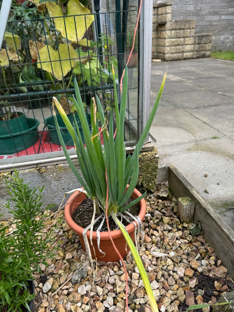The Welsh Onion is a kind of perpetual spring onion. I bought two this year. Put one inside the greenhouse, where it suffered and nearly died. The other I put outside in this pot, where it has thrived. I am now going to split it up into single plants and replant each one separately. This should give us a nice crop of spring onions next year. The one inside the greenhouse has already been split up and replanted outside. It is now looking much more healthy.