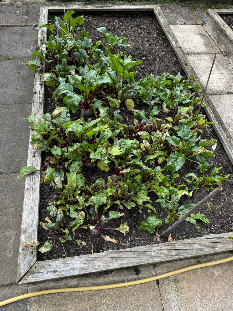 The Beetroot has recovered well after its early decimation by an unknown predator. The beets are now forming and we are going to have one with our dinner tonight. This is really late in the season. We would normally have been harvesting months ago!