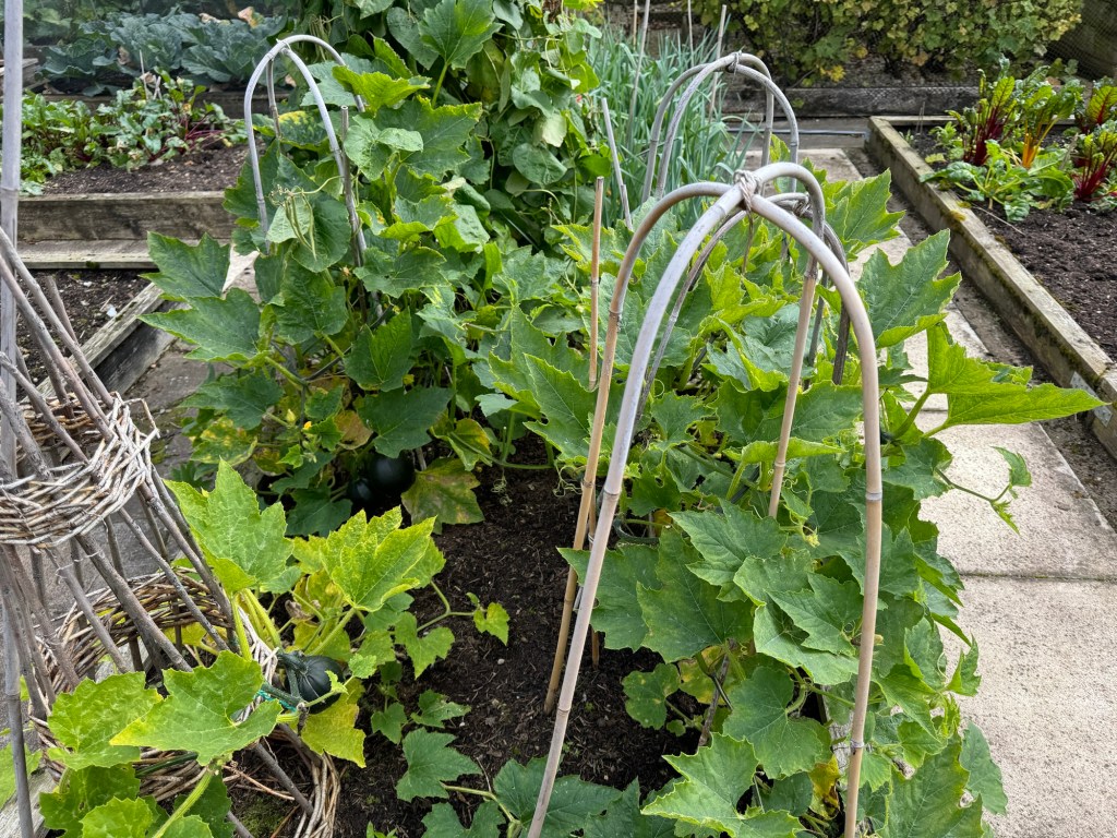 The Gemsquash at the far end of the greenhouse have climbed all the way up their trellis’s. Again a few fruits so far.