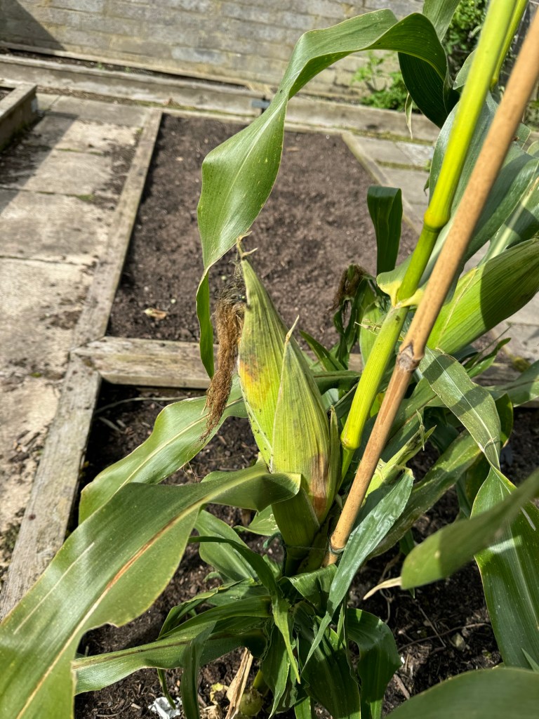 They have produced several cobs and have now ripened. We had our first one last week and it was very disappointing. Not the lovely sweet juicy cobs we are used to. Maybe it’s the variety. Maybe it was overripe. We will try another and see.