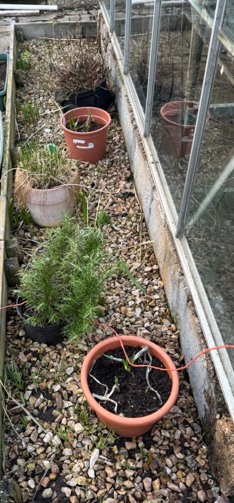 A couple of strawberry plants and last year’s chilli (not looking good at the moment, but I am doing an experiment to see if it will resurrect after winter). 🤞