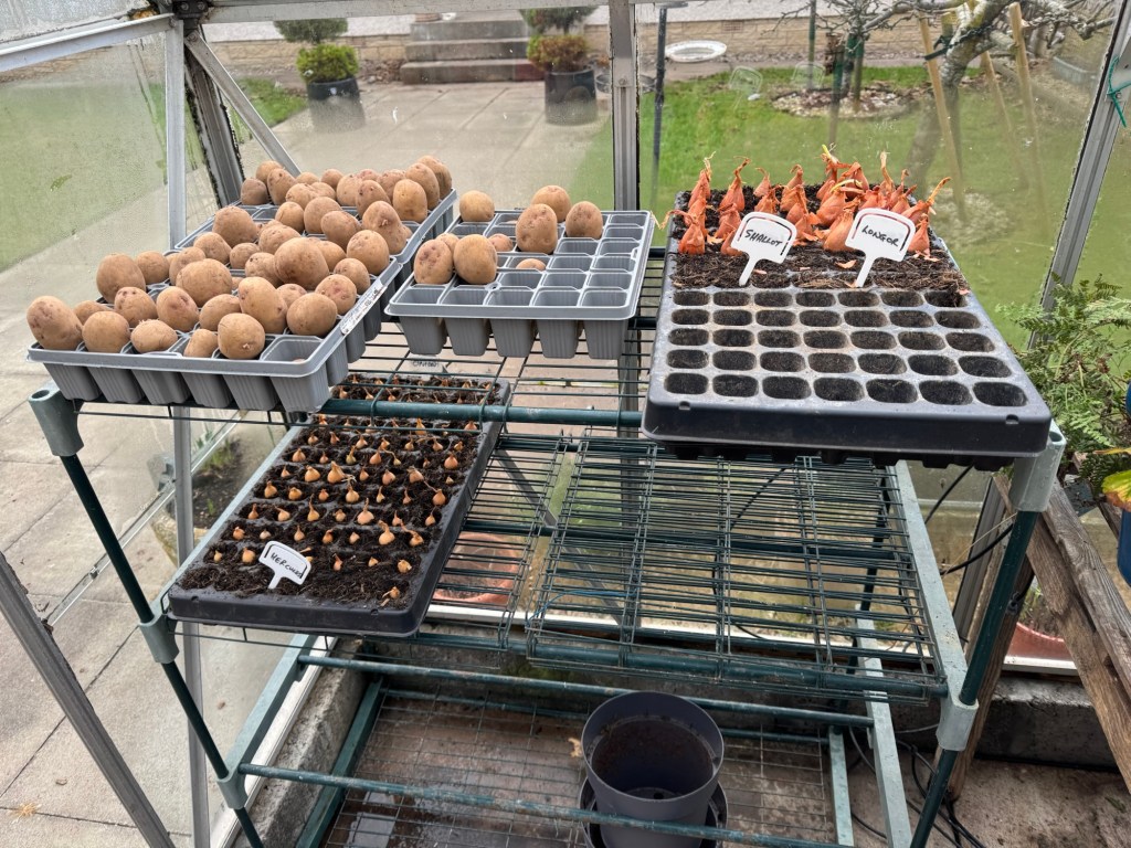 Potatoes – Picasso have just arrived and were set out today to start chitting. This is a process whereby they develop tiny shoots in response to light, much as old potatoes do if you keep them in the kitchen for too long! This allows them to grow quicker and better when they are planted. It’s a sort of pre-conditioning.