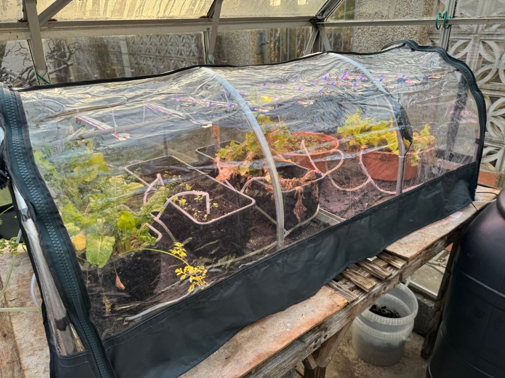I have a “salad bar” growing in a mini-greenhouse within the greenhouse. This saves having to heat the entire greenhouse to the required temperature. Winter sunlight is so minimal at this time of year that the lights are essential to get any growth at all