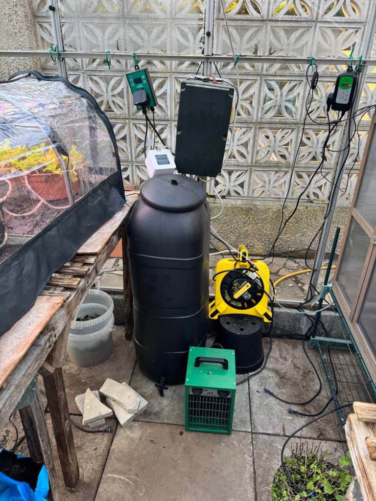 The whole greenhouse is kept just above freezing by the thermostatically controlled greenhouse heater in the photo.