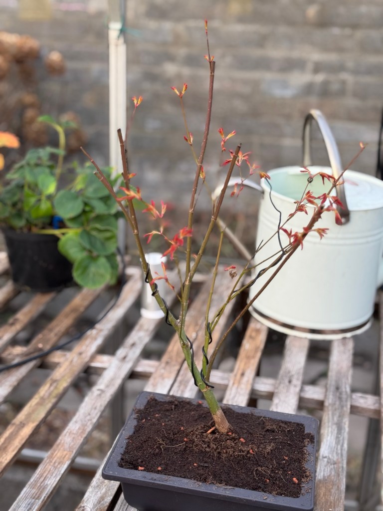 The Acer Palmitum Atropurpureum (right) is also looking fine and has grown tiny little buds along its branches
